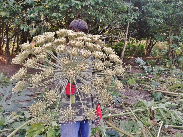 Ve vztahu k člověku je nutné upozornit na fototoxické látky furanokumariny obsažené v celé rostlině. Při kontaktu s lidskou pokožkou a následném absorbování světla (UV ozářením) mění molekulovou strukturu v zasažené tkáni na toxickou. Způsobují velmi obtížně se hojící puchýře, zanechávající dlouhodobé jizvy. Látky při kontaktu s okem mohou mít za následek až oslepnutí. Expozice rozvířených šťáv může u citlivějších osob vyvolat respirační potíže až alergické reakce.