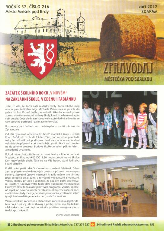 Zářijové číslo Zpravodaje městečka pod Skalkou přináší kromě obvyklých zpráv z radnice, škol a předškolních zařízení rozhovor s novou ředitelkou ZŠ Mníšek Mgr. Michaelou Pažoutovou, rozhovor s představiteli o.s. OÁZA o dalším směřování tohoto významného mníšeckého sdružení, informaci k říjnovým volbám, anketní list k využití komerčních prostor v projektu Mníšecký Eden a mnoho dalších zajímavostí.