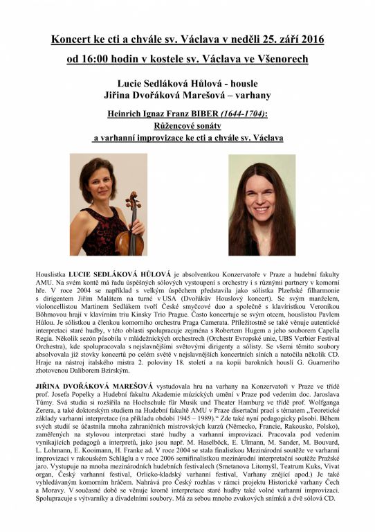 Houslistka Lucie Sedláková Hůlová a varhanice Jiřina Dvořáková Marešová přednesou ve všenorském kostele Růžencové sonáty Heinricha I. F. Bibera a varhanní improvizace ke cti a chvále sv. Václava.