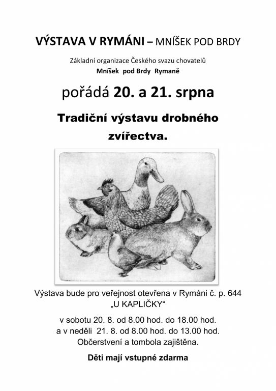 Můžete si prohlédnout i koně na nedaleké pastvině. Některá vystavená zvířata budou i prodejná. Součástí výstavy je občerstvení a příjemné posezení v domácím prostředí. Výstava bude otevřena v Rymani u místní kapličky na zahradě u Kožíšků č. p. 644v sobotu 20. 8. od 8.00 hod do 18.00 hod. a v neděli 21. 8. od 8.00 hod. do 13.00 hod.