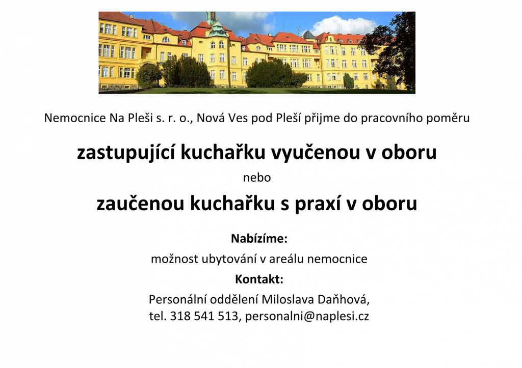 Nemocnice Na Pleši s. r. o., Nová Ves pod Pleší přijme do pracovního poměru zastupující kuchařku vyučenou v oboru